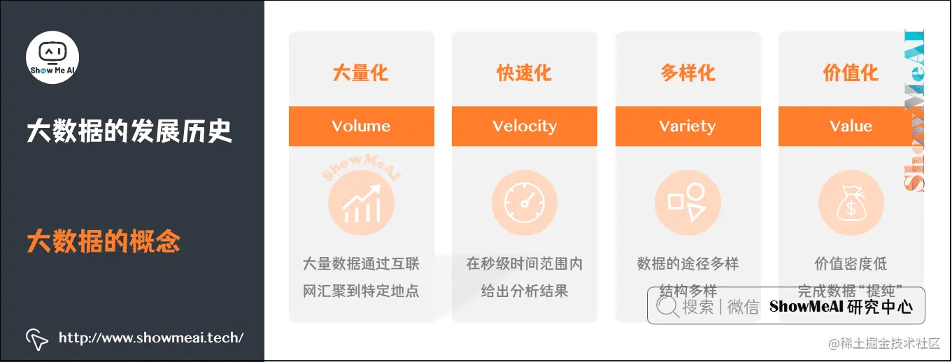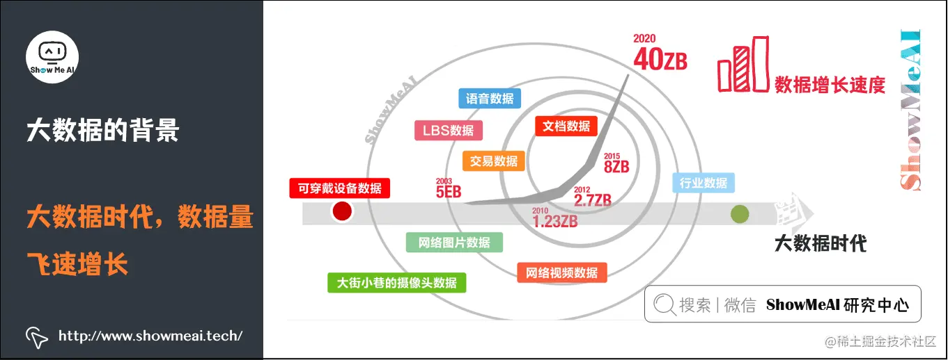 随着互联网高速发展,网络数据呈现出指数级别的快速增长,企业应用需要处理的数据量也变得非常巨大,轻松达到了TB、PB甚至EB、ZB级别,需要巨型存储空间进行存储。而对这些数据进行处理和分析挖掘,仅仅使用单机处理已经无法完成,这个大背景下,针对海量数据处理的大数据解决方案应运而生。ShowMeAI将在接下来的内容中逐步展开讲解大数据生态工具的应用,以及大数据的处理分析挖掘方法。