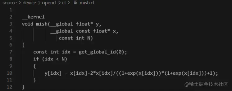 (4)添加 kernel 实现,即在 cl 文件夹中增加 mish.cl 文件,如下: