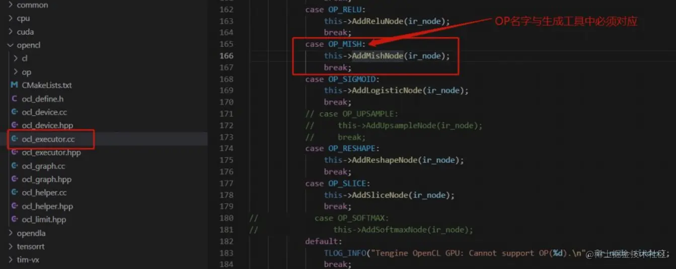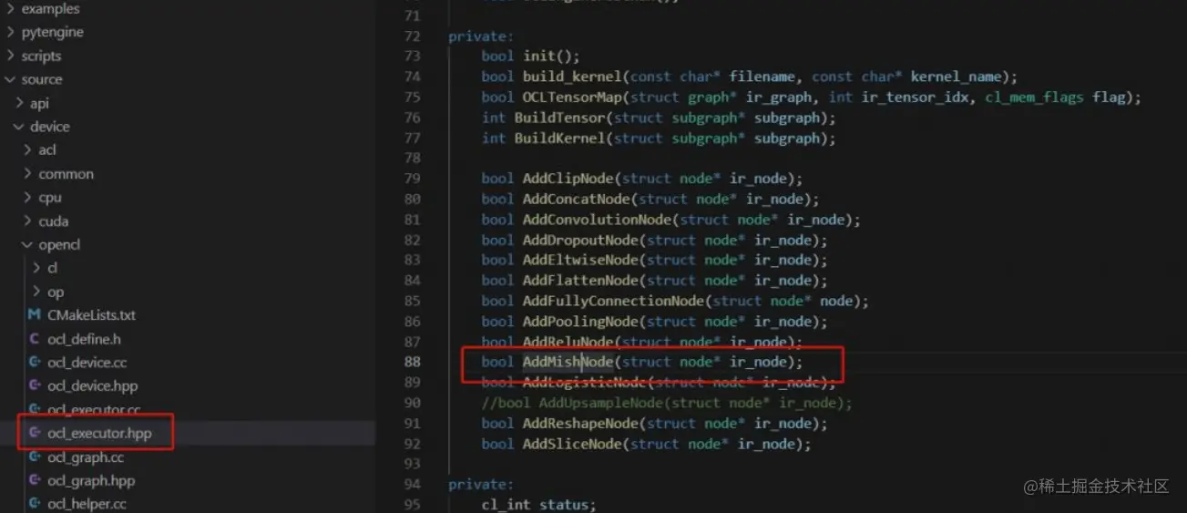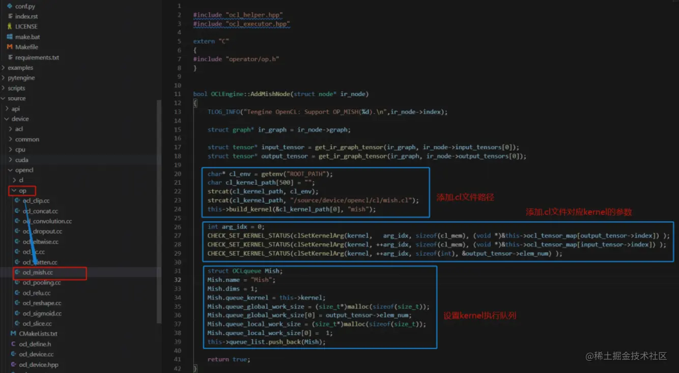 (3)在 op 文件夹中新增一个 ocl_mish.cpp,用于实现函数 AddMishNode 的功能,如下: