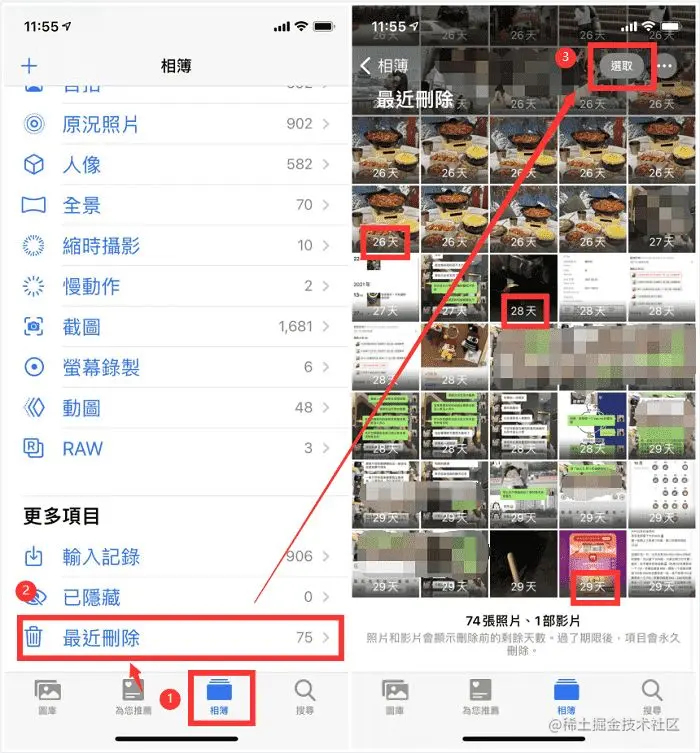 首先打开iPhone的相册,点击底部的第三个选项,滑到最底部,然后点击 “最近删除” ,会看到最近删除的照片,并且每张照片都会标明已经删除了多少天,点击右上角的 “选取” ,把想要恢复的照片选中,最后点击 “恢复” 就可以了。