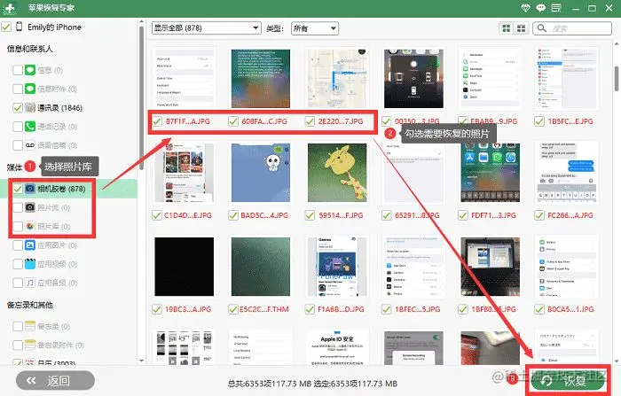 步骤二: 扫描完成后,选中“相机胶卷”,就会看到iPhone上的所有照片,红色字符的照片表示已经删除,从中勾选想要恢复的照片,最后点击“恢复”即可。