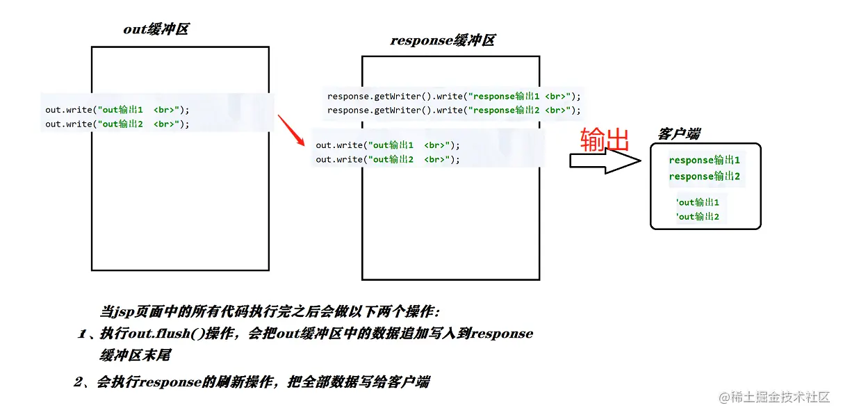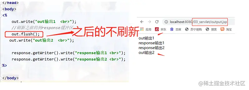 1、执行out.flush()操作,会把out缓冲区的数据追加写入到response缓冲区末端。