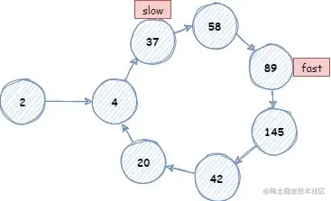 我们还可以通过快慢指针来标记元素,一旦进入了循环,快指针迟早能多绕一圈然后找到慢指针,所以快慢指针一旦相同且不为 1,那么则表示陷入无限循环了。