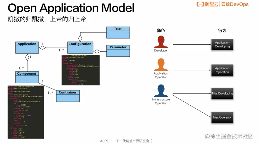 为了解决这个问题,阿里联合微软一起发布了OAM模型,以应用为统一维度,将IaC包含的各类资源和角色进行了分类和聚合。