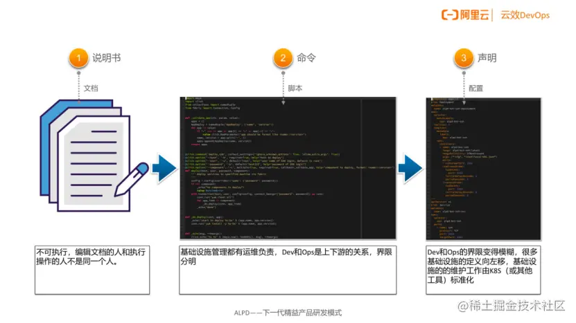 为了解决命令脚本的维护和稳定性问题,我们进入了第三个阶段,声明式——通过配置的方式表达环境,把环境定义出来。声明式的描述提供了环境的确定性表达。