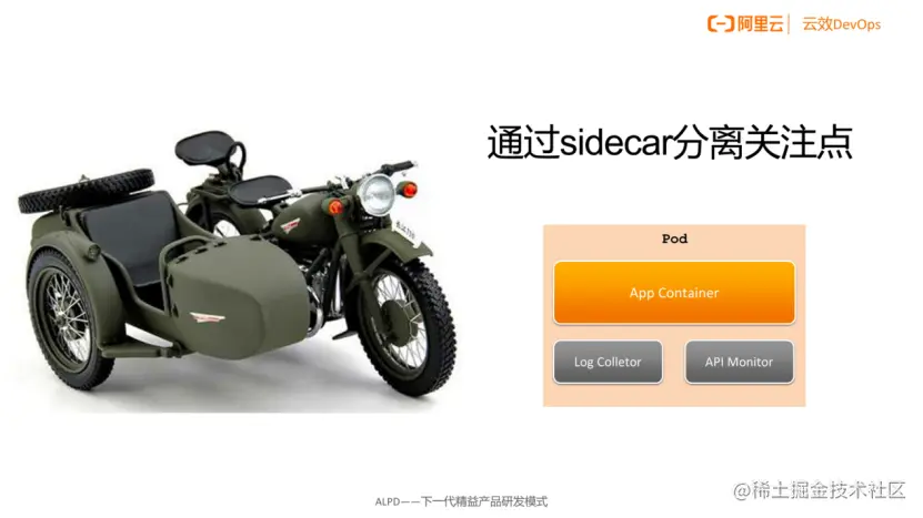 我们写一个应用,这个应用里面大量的代码其实与业务无关,而是包含很多服务治理的代码,例如日志、监控、限流、熔断等。这些代码占了很大的比重,而且这些代码的维护者和应用开发者不一定是同一批人。服务治理相关的代码,在很多企业会有专门的团队负责维护和升级,类似阿里的中间件团队。传统的情况下,我们需要升级并重新部署应用才能升级服务治理能力。但是在云原生时代,应用开发者希望仅关注应用业务代码,服务治理相关的代码放在其他的容器里面,业务容器和服务治理容器通常会编排在同一个pod里面,但是服务治理容器的管理、开发、发布都跟应用开发者没有关系,这些就是sidecar容器。sidecar容器实现了关注点的分离,应用的开发者和中间件的开发者以及运维相关的开发者,都可以有自己的关注点。