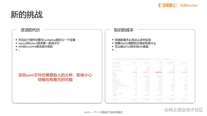 然而,用声明式的方式定义环境也并不完美。举个具体的例子,在应用运行的时候需要有一些相应的配置,中间件、基础资源、CPU、存储等都需要配置,这样会面临一个很大的问题——环境相关的配置太多了。