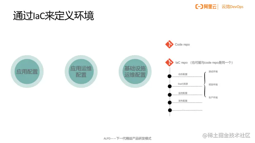 从配置的角度,我们有应用配置、运维配置、基础设施运维配置,甚至软件生产过程的配置。我们把应用代码和IaC代码,放在两个库里面(也有放到一个库里面的,各有利弊,在此我们不展开也不评价)。