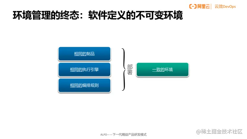 当制品相同、运行上下文相同,并且资源数据是一样的情况下,基于相同的编排规则,环境就应该是一致的。同时,环境可以由软件来定义和声明。这是我们认为的环境管理的终态,简单来说,即软件定义的不可变环境。软件定义的不可变环境,可以纳入版本管理,保证环境首先是定义明确的,其次是有明确版本的。