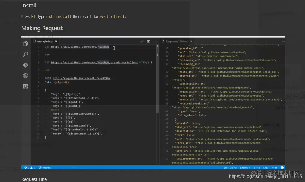 - REST Client(强烈推荐 功能与postman一致 建立一个.http后缀的文件 把接口相关链接 请求方式 参数等放在里面 可以直接点Send Request或者快捷键 Ctrl+Alt+r就可以查看请求返回信息)