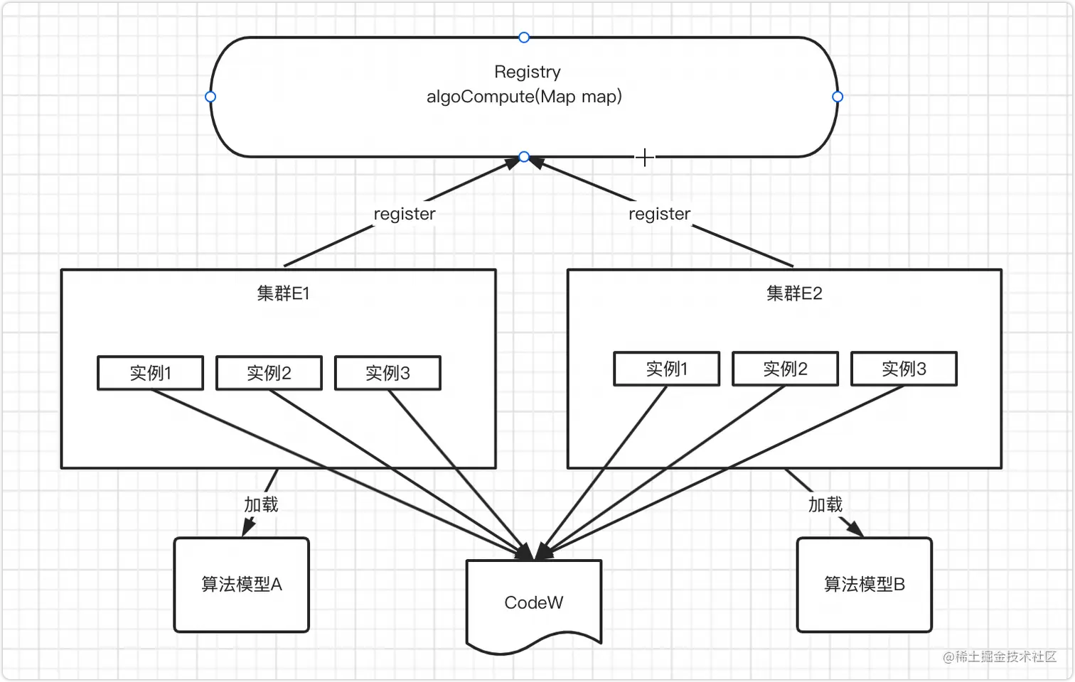 现在我们有两个服务集群E1和E2,两个集群中的服务使用的代码都是CodeW。但是集群E1只可以支持加载算法模型A的调度,集群E2只可以支持算法模型B的调度。此时就会有一个问题,集群E1和E2提供在Dubbo上的接口algoCompute(Map map)其实在服务提供者层面是无区别的,都是同一个方法的提供者(因为Dubbo2.x版本目前还是使用接口粒度的服务发现机制)。