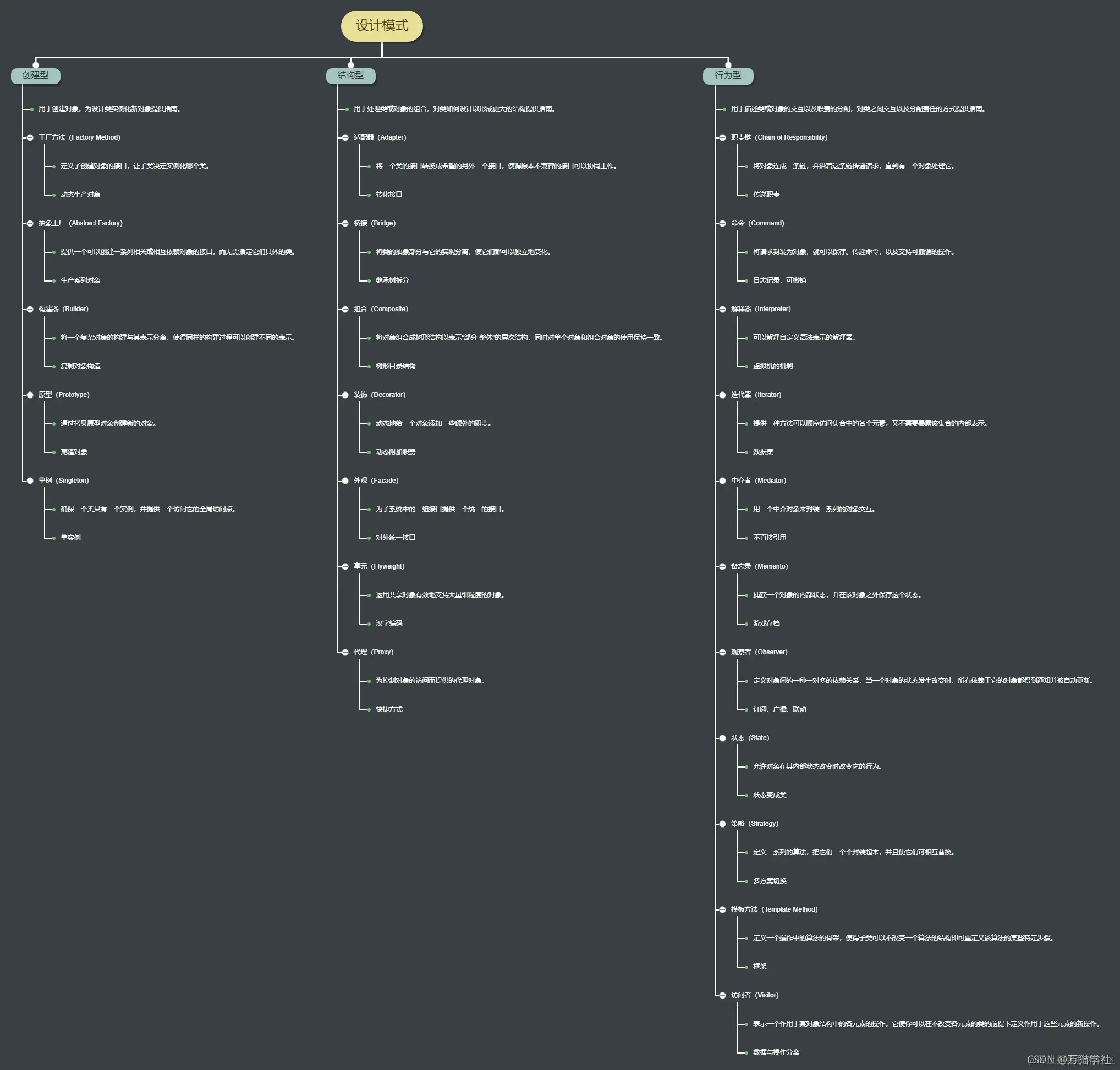 | 访问者 | Visitor | 表示一个作用于某对象结构中的各元素的操作。它使你可以在不改变各元素的类的前提下定义作用于这些元素的新操作。 | 数据与操作分离 |