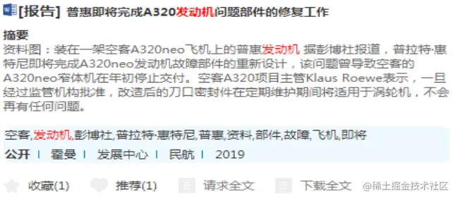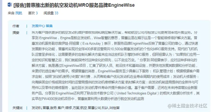 图 2. 显示了“普惠推出新的航空发动机 MRO 服务品牌 EngineWise”相关的其它文献,可以看出来本文献和相关文献都是关于发动机维修(MRO)的。