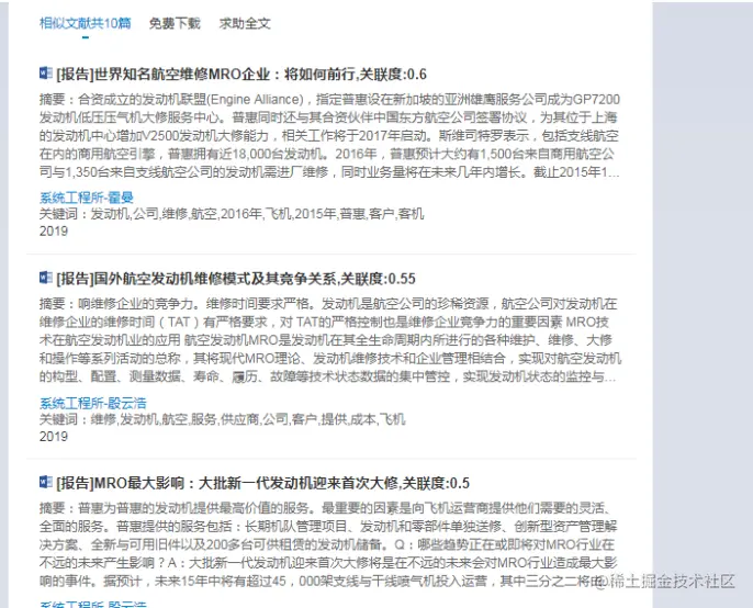 该功能背后的数据科学原理就是可信度计算:同时出现在文献 1 和文献 2 的关键词个数占文献 1 关键词个数的比例大小,取值为(0,1],数值越大,相关度就越高。“温润如玉的长荣航空皇玺桂冠舱.docx”相关的文献集合如下, 可以看出来,这些文献都是关于民航飞行的。