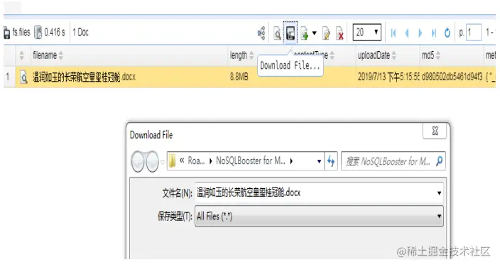 图 2.采集后文献保存在 MongoDB 数据库(GridFS)当中。从图中可以看到保存在数据库当中的“温润如玉的长荣航空皇玺桂冠舱.docx”文献,数据库管理员可以完整地把文献下载到本地。