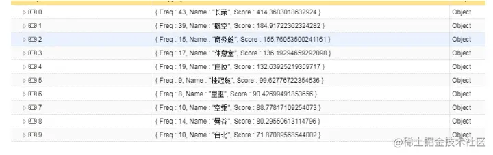 图 2. 提取出来的关键词。本文献提取出来的关键词为: 长荣,航空,商务舱,休息室,座位,桂冠舱,台北等。