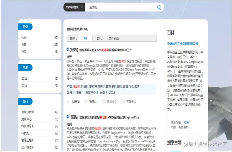 图 1. 用户检索文件名称包含“发动机”的文献。用户提交了关键词“发动机”后,网页就显示出相关的文献集合。如果文献数量太多,用户可以点击分页查看更多的内容。本次检索出72个相关的文献内容,左侧显示了对这72条记录进行了相应的分类汇总(密级、年度、作者、部门等)
