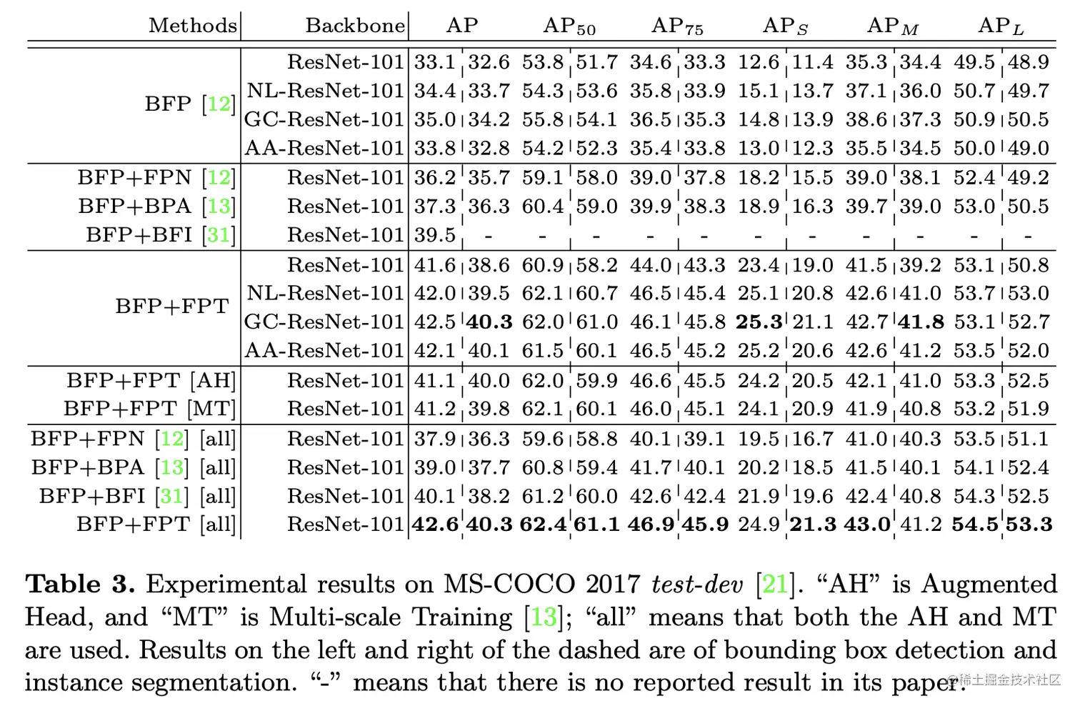 论文提出用于特征金字塔的高效特征交互方法FPT,包含3种精心设计的特征增强操作,分别用于借鉴层内特征进行增强、借鉴高层特征进行增强以及借鉴低层特征进行增强,FPT的输出维度与输入一致,能够自由嵌入到各种包含特征金字塔的检测算法中,从实验结果来看,效果不错
