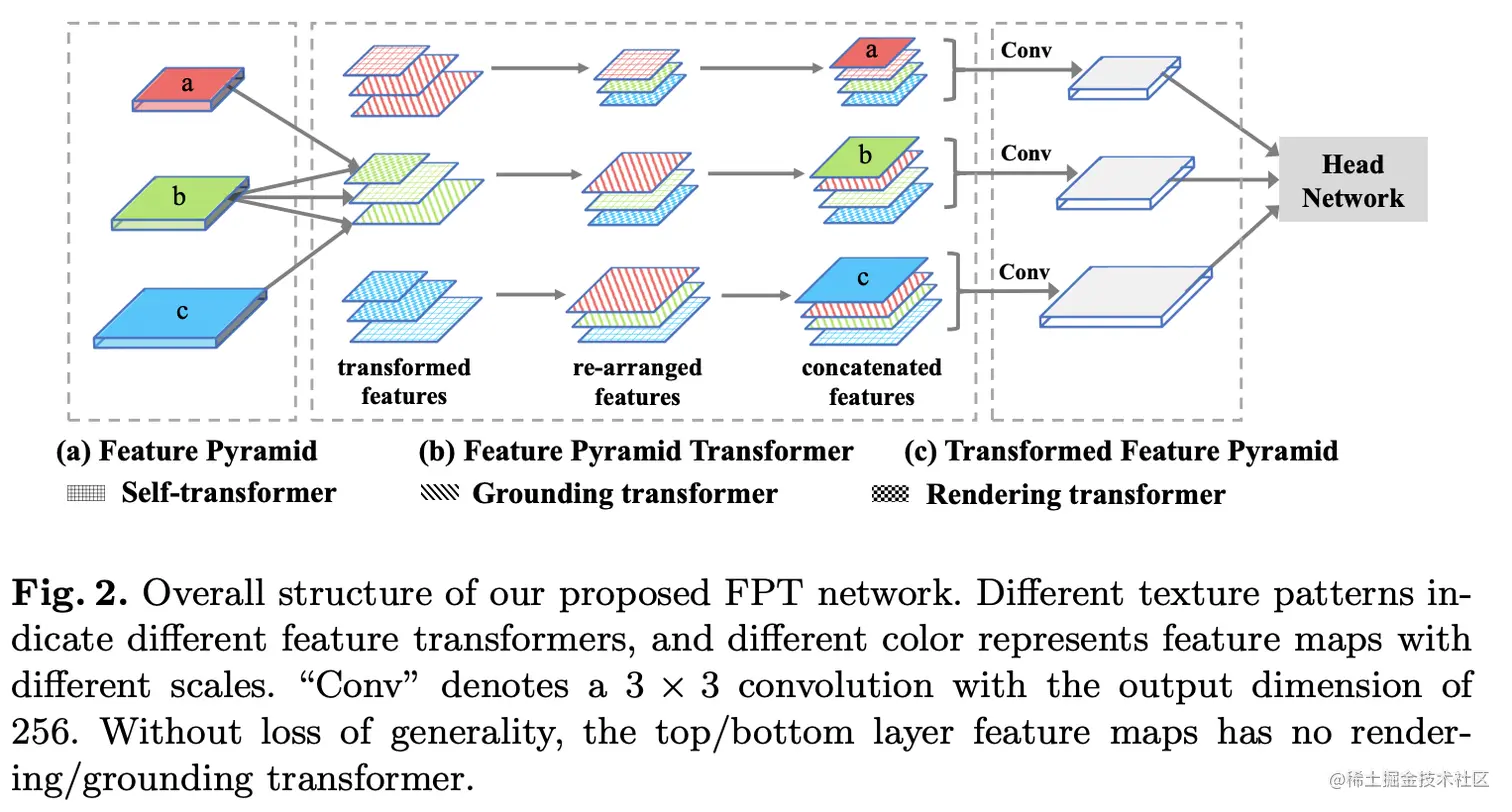 FPT的特征转换流程如图2所示,输入为金字塔特征,首先对每层特征分别进行ST、GT、RT特征增强得到多个增强后的特征,然后对增强的特征按尺寸进行排序,将相同大小的特征concate到一起,通过卷积将增强后的特征维度恢复到输入时的相同维度。