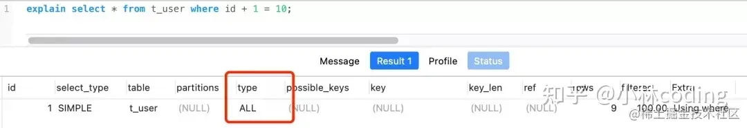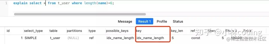 比如下面这条语句查询条件中对 name 字段使用了 LENGTH 函数,执行计划中的 type=ALL,代表了全表扫描: