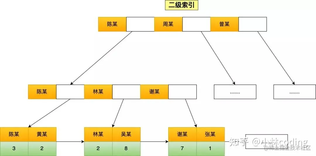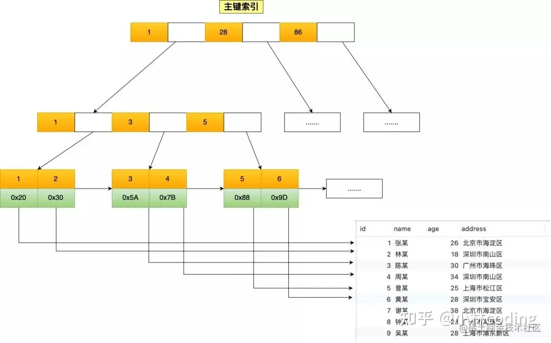 InnoDB 存储引擎根据索引类型不同,分为聚簇索引(上图就是聚簇索引)和二级索引。它们区别在于,聚簇索引的叶子节点存放的是实际数据,所有完整的用户数据都存放在聚簇索引的叶子节点,而二级索引的叶子节点存放的是主键值,而不是实际数据。
