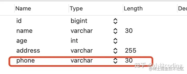 我在原本的 t_user 表增加了 phone 字段,是二级索引且类型是 varchar。