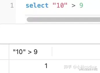 - 如果规则是 MySQL 会将自动「字符串」转换成「数字」,就相当于 select 10 > 9,这个就是数字比较,所以结果应该是 1;