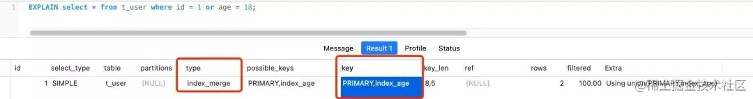 可以看到 type=index merge, index merge 的意思就是对 id 和 age 分别进行了扫描,然后将这两个结果集进行了合并,这样做的好处就是避免了全表扫描。