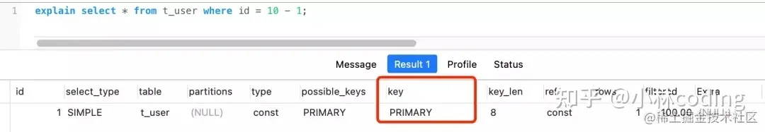 有的同学可能会说,这种对索引进行简单的表达式计算,在代码特殊处理下,应该是可以做到索引扫描的,比方将 id + 1 = 10 变成 id = 10 - 1。
