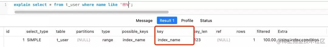 然后我再用下面这条查询语句,这时候就会走索引了。