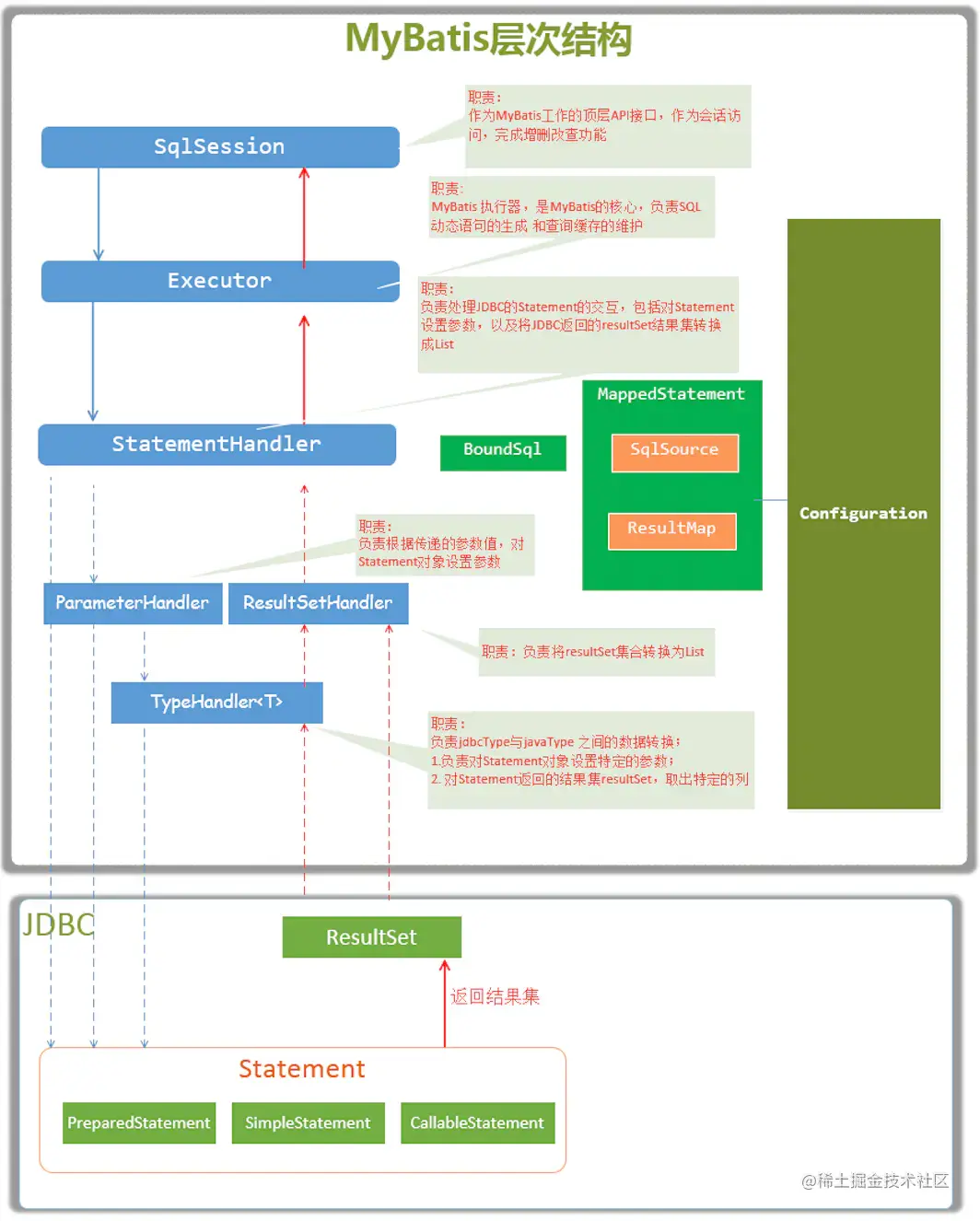 | StatementHandler | 封装了JDBC Statement操作,负责对JDBC statement的操作,如设置参数、将Statement结果集转换成List集合 |
