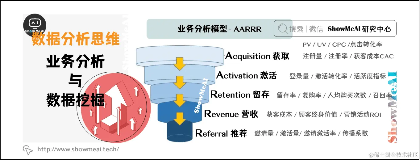 AARRR是一个产品的生命增长周期,描述了不同阶段的用户参与行为的深度,即: Acquisition(获取用户)、 Activation(激发活跃)、Retention(提高留存)、 Revenue(增加收入)、 Referral(传播推荐)。它能通过层与层之间用户的转化数,即转换率,来定位问题出在哪。