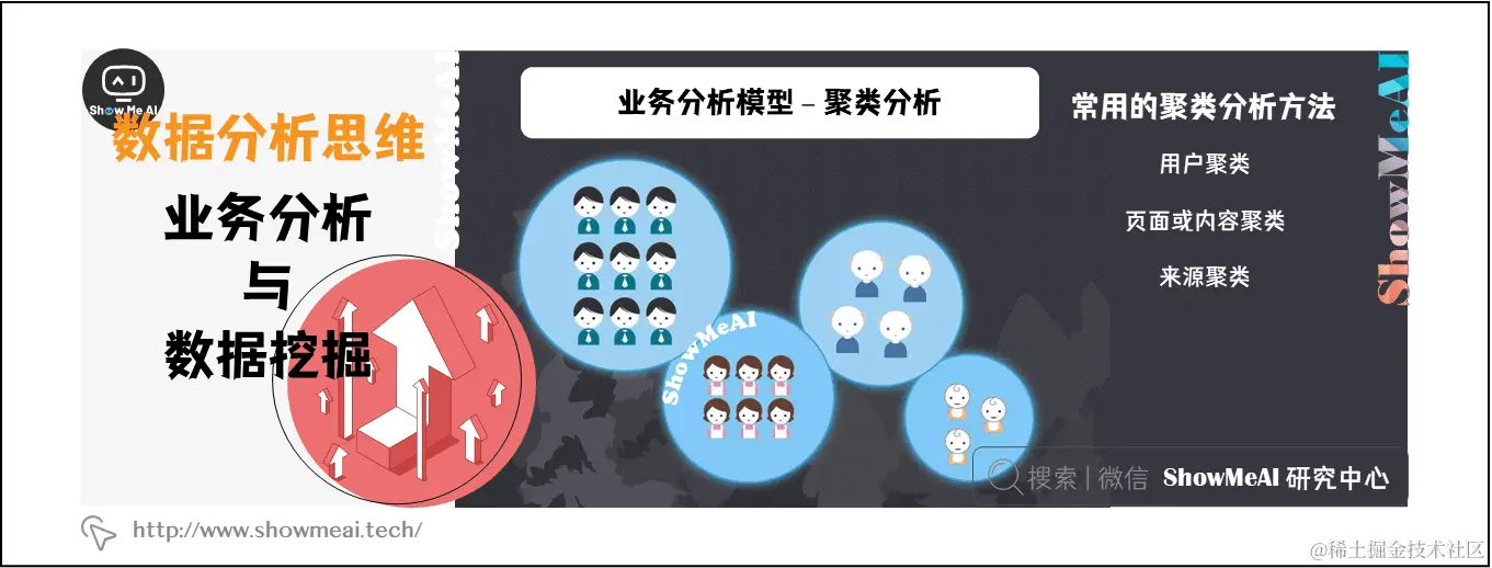 聚类分析是将数据分为相对同质的群组的分析方法。网站分析中的聚类主要分为:用户聚类、页面或内容聚类或来源聚类。用户聚类主要体现为用户分群,用户标签法页面聚类则主要是相似、相关页面分组,来源聚类主要包括渠道、关键词等。