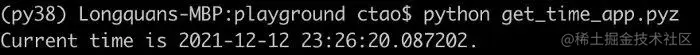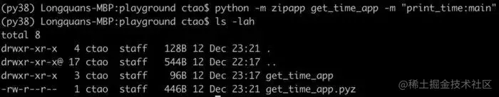 如果我们想要创建一个简单的应用,比如前面写的获取当前时间的应用程序,我们不必再需要像 PyInstaller 这样的第三方工具包,Python 内置的 Zipapp 就可以做到。假设我们要打包成一个"Get Time"的应用,我们可以在命令行运行下面的命令。
