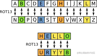 通过 Python CLI,我们可以加密字符串或文件。我们以有趣的 ROT13 加密算法为例进行展示。ROT13 是一种偏移 13 位的凯撒密码,它的加密原理如下图所示。