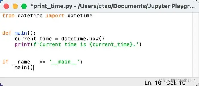 如果文件目录不存在,idlelib将无法创建,因此如果必要,我们需要创建一个。我们运行完这个命令之后,print_time.py 只有执行保存的情况下才会创建到本地。现在应该会弹出编辑器,我们可以在里面写一些代码, 可以看到代码是支持语法高亮的。