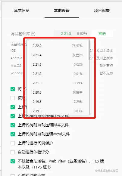 在本地设置中,有调式基础库选项,点击后我们可以发现,可以选择很多版本,有的版本显示的是百分比,有的版本则显示了灰度中,那么到底什么是调式基础库呢、什么又是灰度中呢?下面我会一一进行讲解~