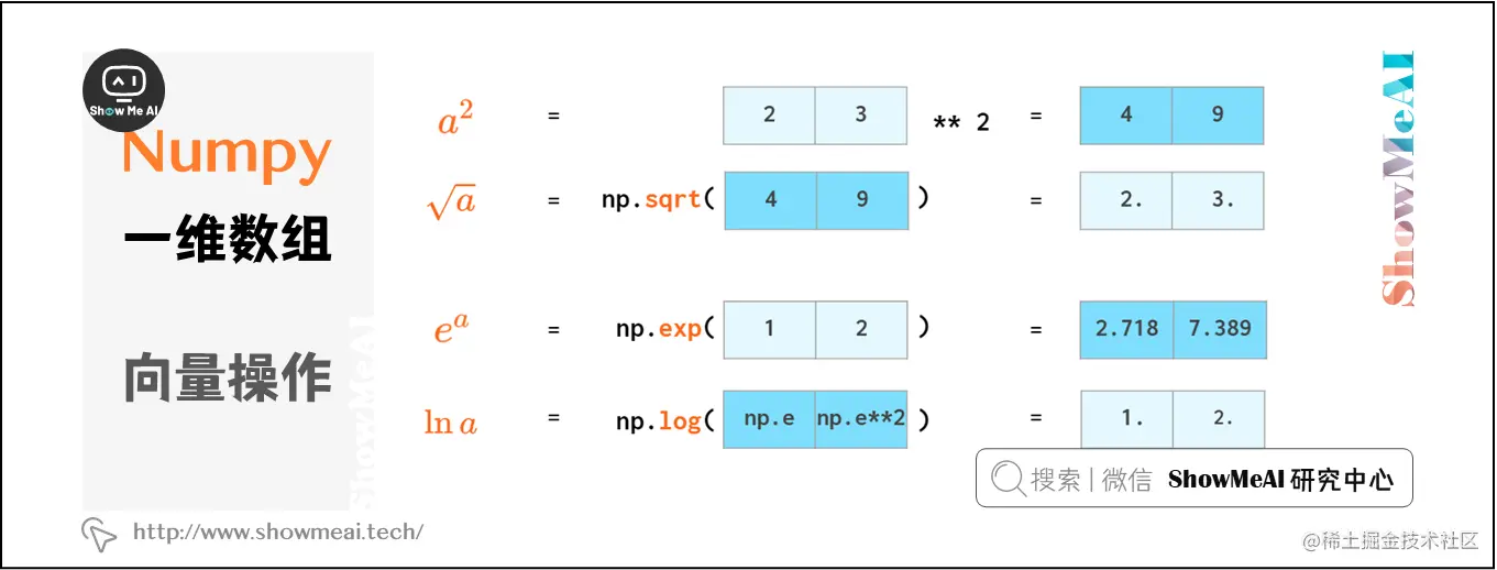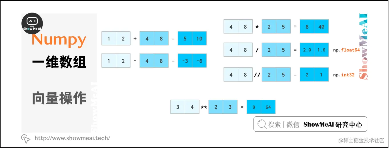 NumPy支持快速计算,向量运算操作接近C++速度级别,并不受Python循环本身计算慢的限制。NumPy允许像普通数字一样操作整个数组: