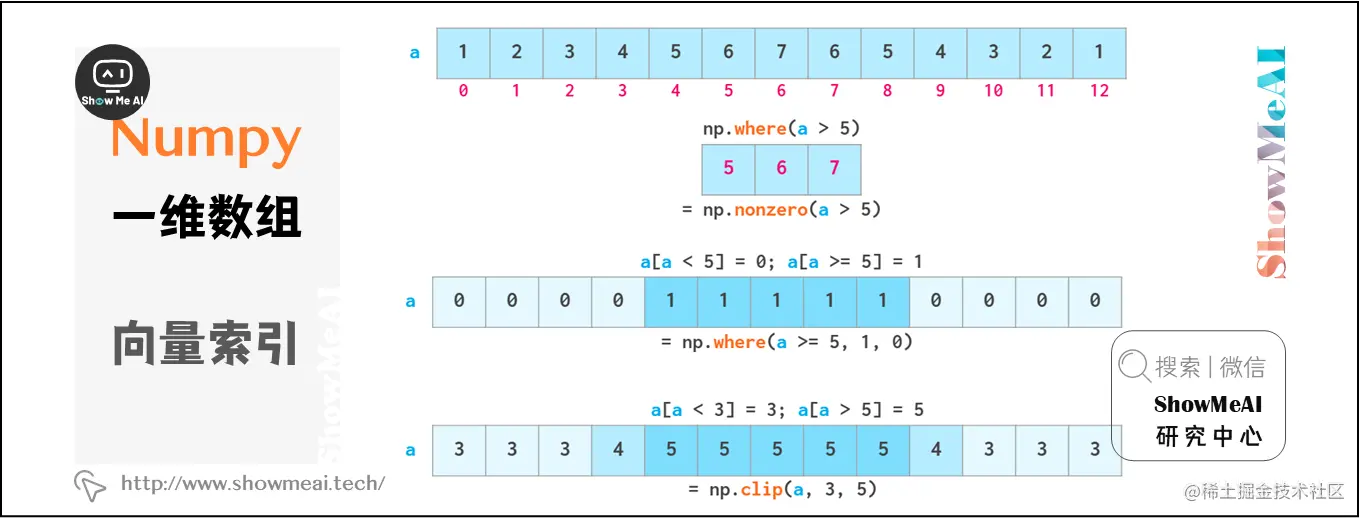 如上所述,布尔索引是可写的。如下图 np.where 和 np.clip 两个专有函数。