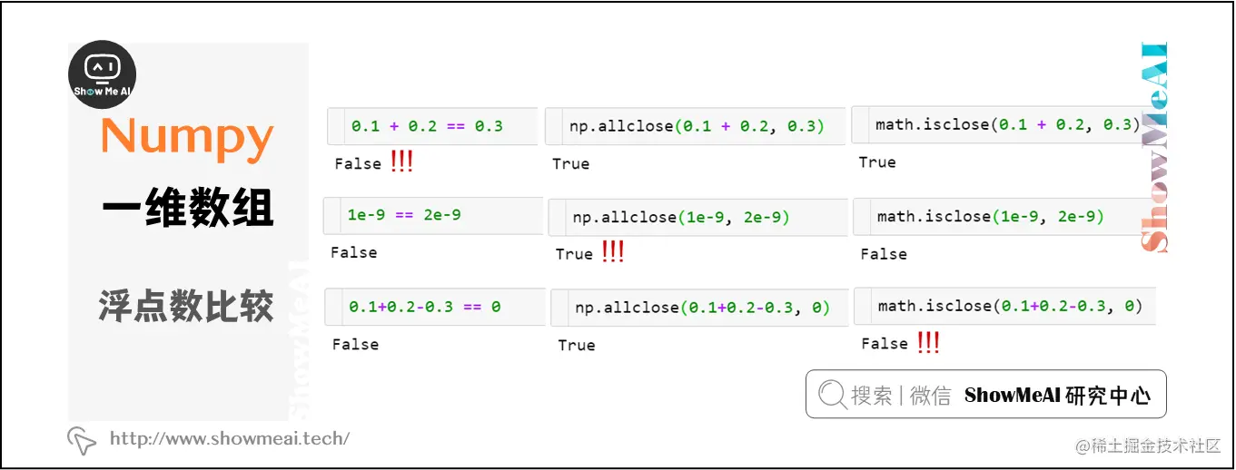 np.allclose(a, b)用于容忍误差之内的浮点数比较。