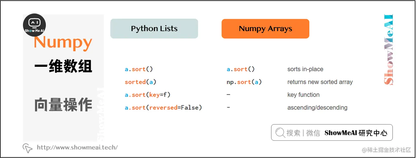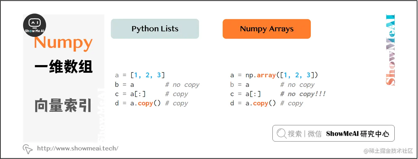 上述所有这些方法都可以改变原始数组,即允许通过分配新值改变原数组的内容。这导致无法通过切片来复制数组。如下是python列表和NumPy数组的对比: