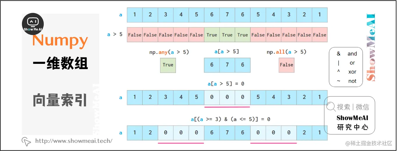 NumPy数组支持通过布尔索引获取数据,结合各种逻辑运算符可以有很高级的数据选择方式,这在Python列表中是不具备的:
