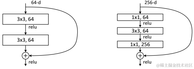 下面我们再分析一下残差单元,ResNet使用两种残差单元,如图6所示。左图对应的是浅层网络,而右图对应的是深层网络。对于短路连接,当输入和输出维度一致时,可以直接将输入加到输出上。但是当维度不一致时(对应的是维度增加一倍),这就不能直接相加。有两种策略:(1)采用zero-padding增加维度,此时一般要先做一个downsamp,可以采用strde=2的pooling,这样不会增加参数;(2)采用新的映射(projection shortcut),一般采用1x1的卷积,这样会增加参数,也会增加计算量。短路连接除了直接使用恒等映射,当然都可以采用projection shortcut。