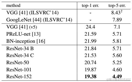 最后展示一下ResNet网络与其他网络在ImageNet上的对比结果,如表2所示。可以看到ResNet-152其误差降到了4.49%,当采用集成模型后,误差可以降到3.57%。