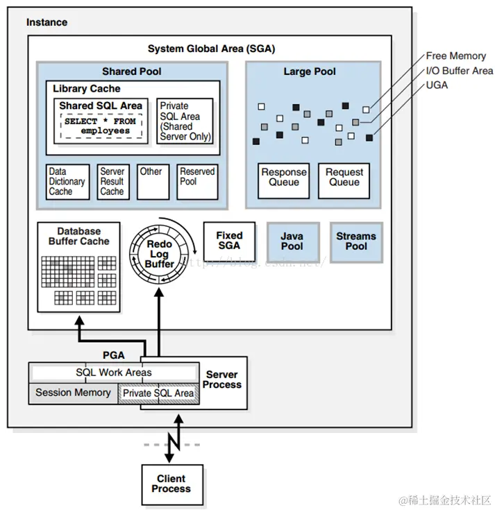 其中SGA是一组共享内存的结构,包含数据和实例的控制信息。所有服务和后台进程共享SGA。例如缓存的数据库和共享的SQL区域。