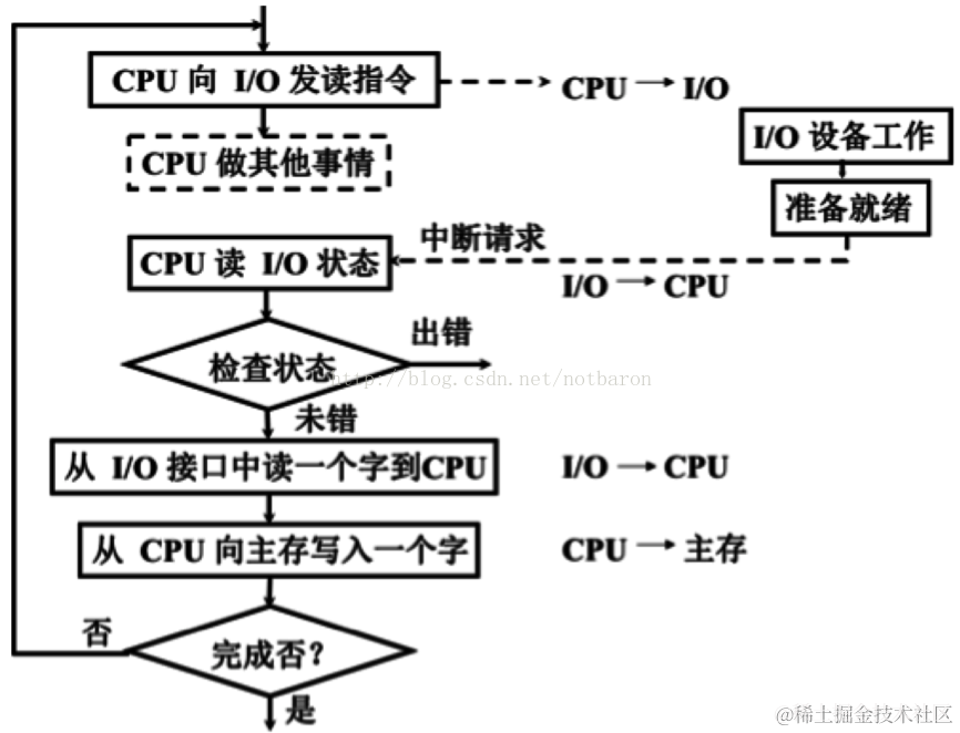 5.计算机组成原理笔记五输入输出系统 badman250 2022-02-25 154 阅读1分钟 计算机组成原理笔记五输入输出系统 本篇名言: “质朴却比巧妙的言辞更能打动我的心。 -- 莎士比亚” 1. 输入输出系统 1.1 I/O 软件 (1) I/O 指令 CPU 指令的一部分 (2) 通道指令 通道自身的指令 1.2 I/O设备与主机信息传送的控制方式 1. 程序查询方式 2. 程序中断方式 程序中断方式流程 3. DMA 方式 主存和I/O 之间有一条直接数据通道 不中断现行程序 周期挪用(周期窃取) \ 三种方式的 CPU 工作效率比较