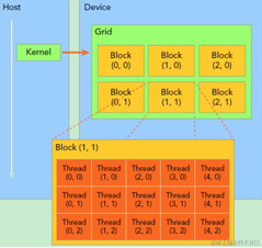 执行相同程序的多个 block,可以组成 grid。 不同 block 中的 thread 无法存取同一块共享的内存,无法直接互通或进行同步。因此,不同 block 中的 thread 能合作的程度是比较低的。不过,利用这个模式,可以让程序不用担心显示芯片实际上能同时执行的 thread 数目限制。例如,一个具有很少量执行单元的显示芯片,可能会把各个 block 中的 thread 顺序执行,而非同时执行。不同的 grid 则可以执行不同的程序(即 kernel)。