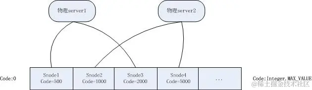 图示中表名,有2个物理server节点,每个物理server节点有多个Snode虚拟节点,server1和server2的虚拟节点互相"穿插"且依次排列,每个snode都有一个code,它表示接受数据的hashcode起始值(或终止值),比如上述图示中第一个snode.code为500,即当一个数据的hashcode值在[0,500]时则会被存储在它上.