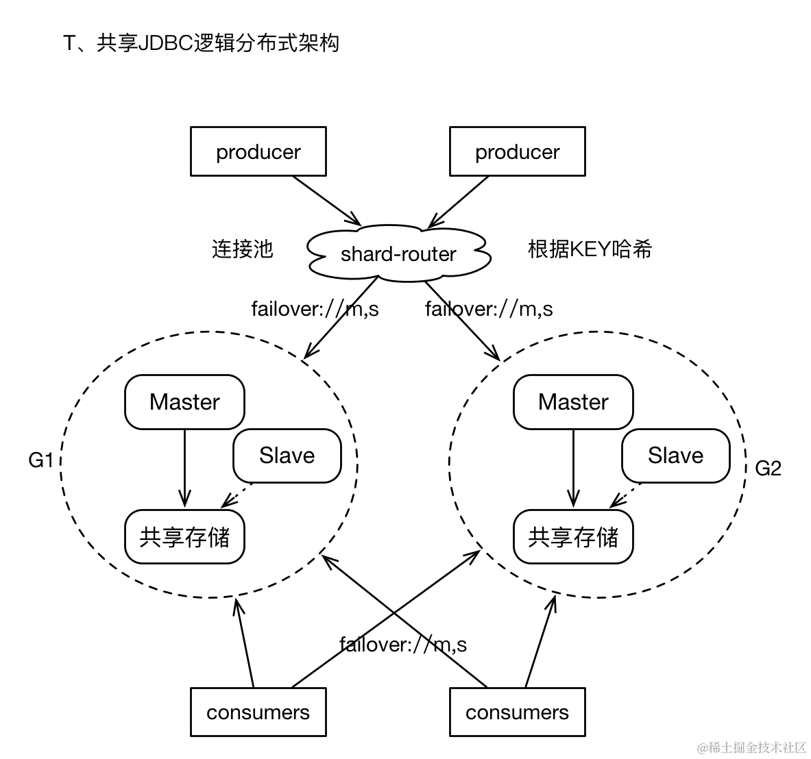 5)如果你不想开发shard-router层面,我们仍然可以基于failover协议来实现“逻辑分布式”的消息散列存储,此时需要在failover协议中指明所有Groups的brokers节点列表,且randomize=true。这种用法,可以实现消息在多个Group上存储,唯一遗憾的地方时,因为缺乏“自动负载均衡策略”,可能导致消息分布不均。