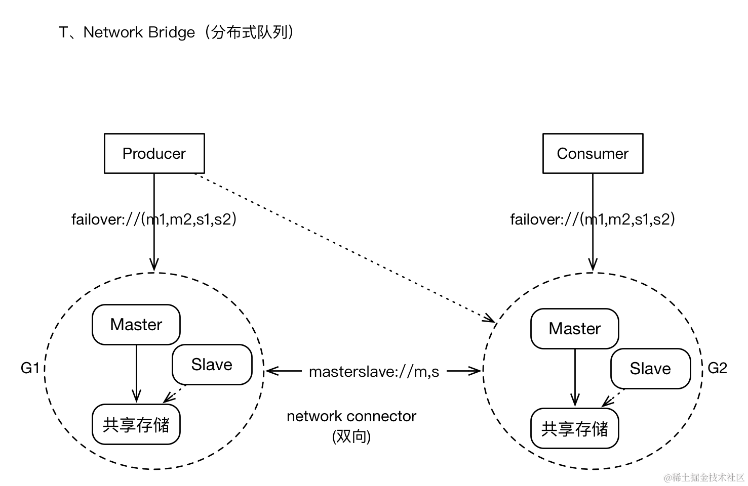 ActiveMQ提供两种可供实施的架构模型:“M-S”和“network bridge”;其中“M-S”是HA方案,“网络转发桥”用于实现“分布式队列”。